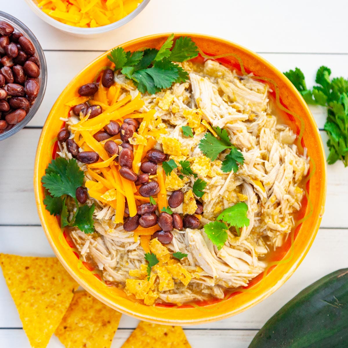 Side Dishes: You can serve the shredded chicken in tortillas or in bowls with rice or quinoa. Then add your favorite toppings like sour cream, shredded cabbage, black beans, cilantro and grated cheese.